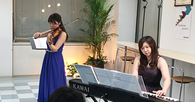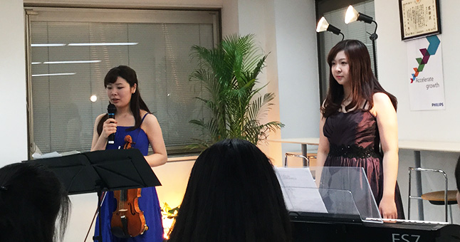 今回は初めて社内コンサートという形の演奏会に出演させていただきましたが、いつもと変わらず、とてもあたたかく場を作っていただいて楽しく弾かせていただきました。少し盛りだくさんなプログラムを組んでしまいましたが、ハードながら色々と勉強させていただきました。また、Vnの腕もトークの腕も磨きをかけて頑張ります‼