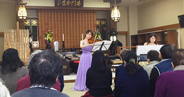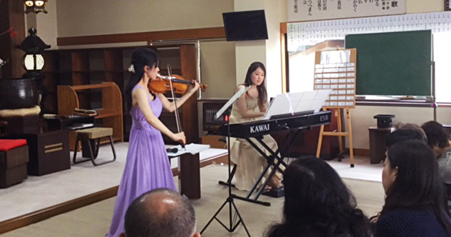 お寺の静かな空気感の中、美しい海を正面に眺めながら、穏やかな気持ちで演奏させていただきました。