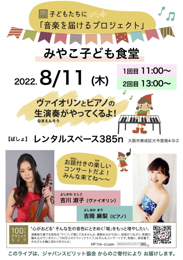 食堂はもちろん素敵な音楽も子どもに聴いてもらいたい事もイメージしておりました。夏休みに開催したいと思っいた矢先にご縁を頂き、大変嬉しく思っています。本物の音楽を聴いて心癒やされ楽器を好きになってもらいたいです。