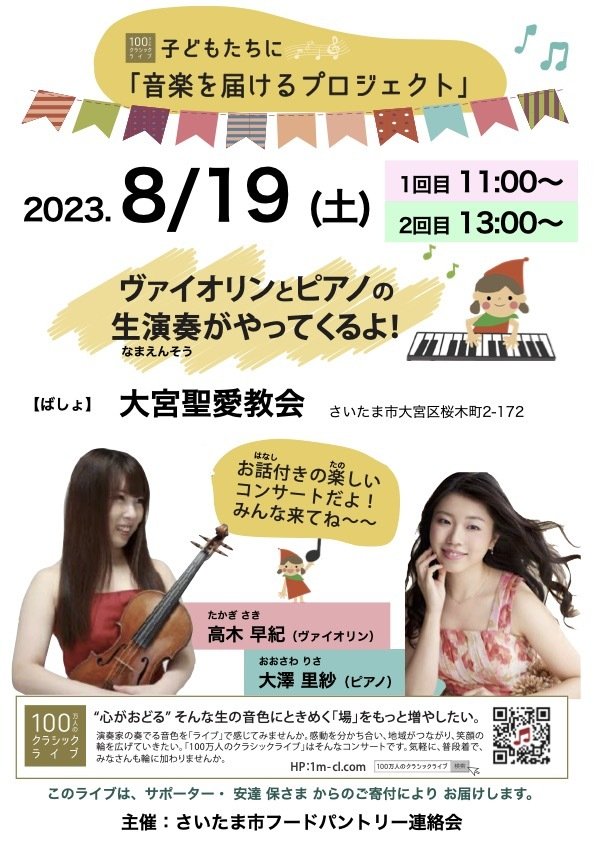 | 演奏 | 高木 早紀(ヴァイオリン)・神野 千恵(ピアノ) 都合により、演奏者が変更となりました。 |