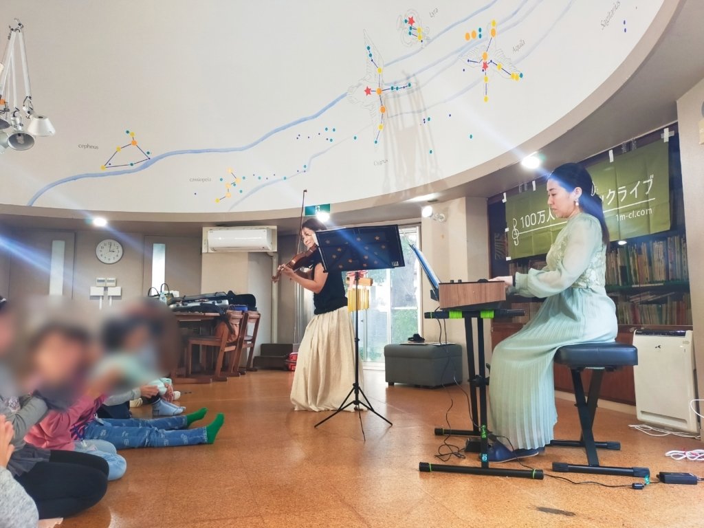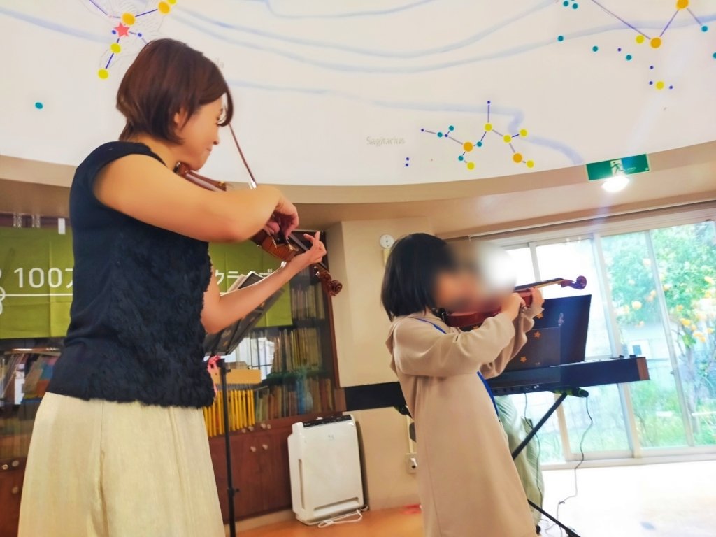 間近で楽器や演奏を、見て、感じて、生の音に触れる貴重な体験が出来ました。今回は、プラネタリウムドームで開催したため、アットホームな雰囲気の中で演奏者様とのコミュニケーションも楽しむことが出来ました。子どもの興味を引き出す曲の説明や、普段味わうことのできないヴァイオリン体験の時間を設けて頂き、子ども達も大喜びでした。