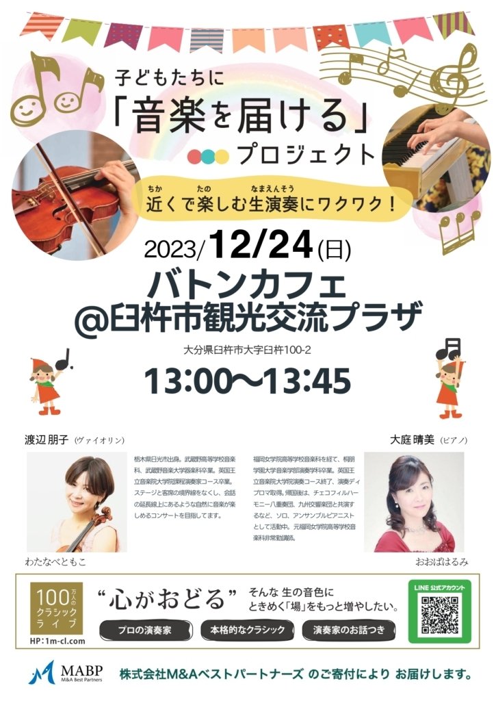 2023活動報告 九州・沖縄 2023/12/24(日)バトンカフェ(大分県臼杵市) 2023.12.24 日時2023/12/24(日)13:00〜13:45場所臼杵市観光交流プラザ住所臼杵市大字臼杵100-2演奏渡辺 朋子(ヴァイオリン)・大庭 晴美(ピアノ)対象子ども食堂の利用者サポーター株式会社M&Aベストパートナーズ 認定特定非営利活動法人おおいた成年後見権利擁護支援センターです。これまでは、自法人事務所で、0歳から120歳まで誰でも参加可能なバトンカフェ(子ども食堂兼)を開催していましたが、定期開催に加えて臼杵市観光プラザを利用してひとり親・多きょうだい世帯を対象に、無料で70食のカレーを提供することになりました。定期開催ではためになるお話や笑いヨガ等を行っていましたが、観光プラザ開催では主にこどもたちが対象ですので、カレーでお腹を満たして、生の音楽で心豊かな時間を過ごしてほしいと願い、ライブを依頼したいと考えました。 ・子どもがバイオリンを弾く姿に感動しました。・演奏会前のリハ演奏を聴きながらカレーをいただきました。とても良かったです。・前回の演奏会がとても良かったので今回も参加しました。また一段と良かったです。また聞きたいです。・生演奏に触れる機会が得られてありがたいです。・親子で楽しみました。生演奏は良いですね。・音楽を聴く子どもたちの、キラキラした瞳が素敵でした。・コンサートの音がすごく綺麗でした。・生演奏のすばらしさを堪能しました。・ヴァイオリンの生演奏がこんなに近くで聞けることに感謝です。